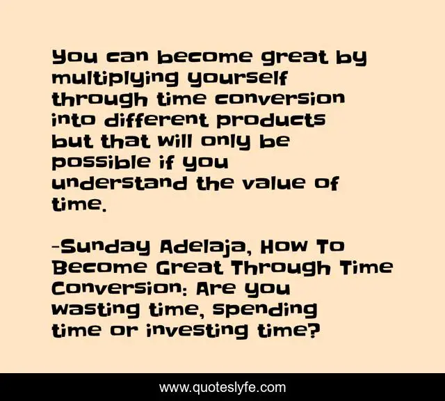 This page presents the quote "You can become great by multiplying yourself through time conversion into different products but that will only be possible if you understand the value of time.". Author of this quote is Sunday Adelaja, How To Become Great Through Time Conversion: Are you wasting time, spending time or investing time?. This quote is about value-of-time, life, multiplying-your-life, conversion, productivity, wealth, greatness, waste, humanity,.