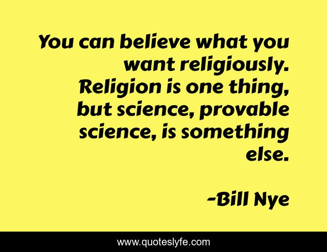 This page presents the quote "You can believe what you want religiously. Religion is one thing, but science, provable science, is something else.". Author of this quote is Bill Nye. This quote is about science, believe,.