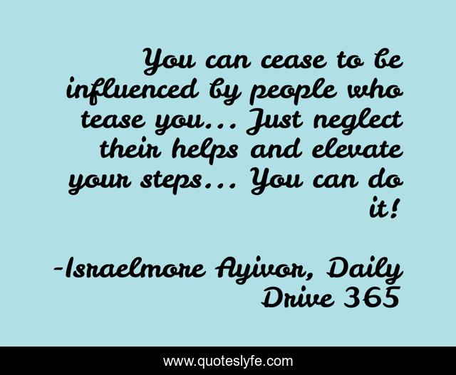 This page presents the quote "You can cease to be influenced by people who tease you... Just neglect their helps and elevate your steps... You can do it!". Author of this quote is Israelmore Ayivor, Daily Drive 365. This quote is about criticism, mockeries, people, negative-people, influence, elevate, laugh, negligence, food-for-thought,.