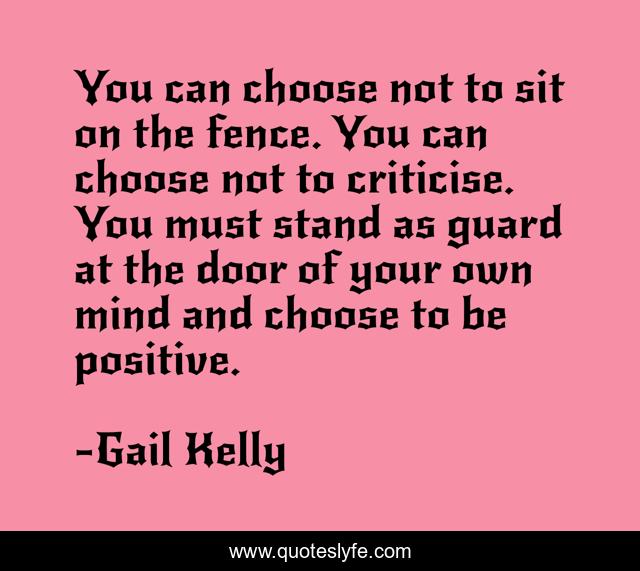 This page presents the quote "You can choose not to sit on the fence. You can choose not to criticise. You must stand as guard at the door of your own mind and choose to be positive.". Author of this quote is Gail Kelly. This quote is about door, mind,.