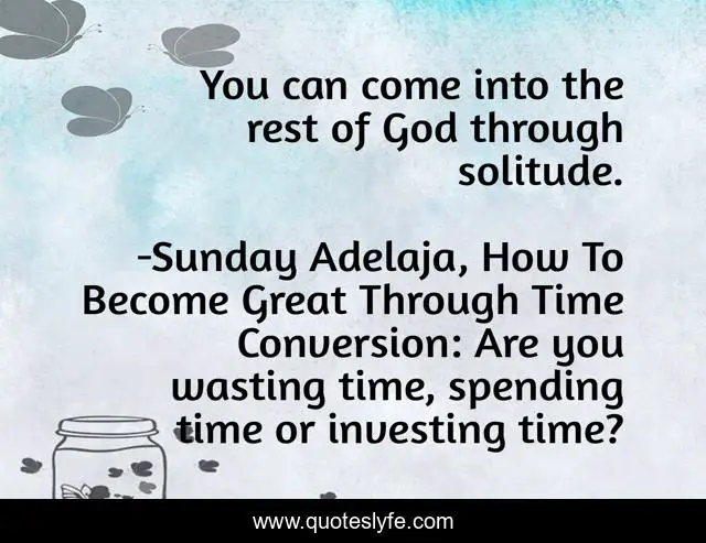 This page presents the quote "You can come into the rest of God through solitude.". Author of this quote is Sunday Adelaja, How To Become Great Through Time Conversion: Are you wasting time, spending time or investing time?. This quote is about conversion, solitude, productivity, wealth, gift, world, god, work, life,.