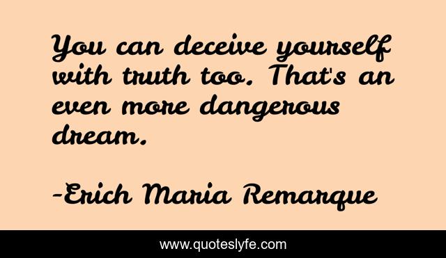 This page presents the quote "You can deceive yourself with truth too. That's an even more dangerous dream.". Author of this quote is Erich Maria Remarque. This quote is about dangerous, self, deception, dream, lies,.