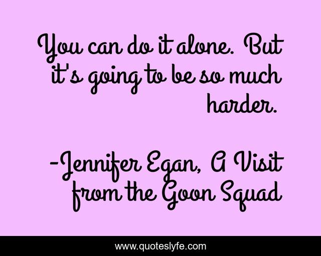 This page presents the quote "You can do it alone. But it's going to be so much harder.". Author of this quote is Jennifer Egan, A Visit from the Goon Squad. This quote is about alone, enthusiasm, trust, help, inspirational,.