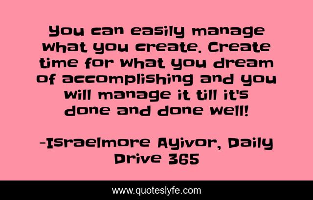 This page presents the quote "You can easily manage what you create. Create time for what you dream of accomplishing and you will manage it till it's done and done well!". Author of this quote is Israelmore Ayivor, Daily Drive 365. This quote is about food-for-thought, management, skillfulness, skills, create, manage, create-time, make-time, time,.