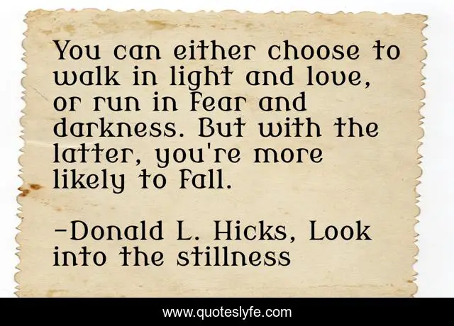 This page presents the quote "You can either choose to walk in light and love, or run in fear and darkness. But with the latter, you're more likely to fall.". Author of this quote is Donald L. Hicks, Look into the stillness. This quote is about spiritual, love, light, failure, fall, fear, affection, walk-in-light,.