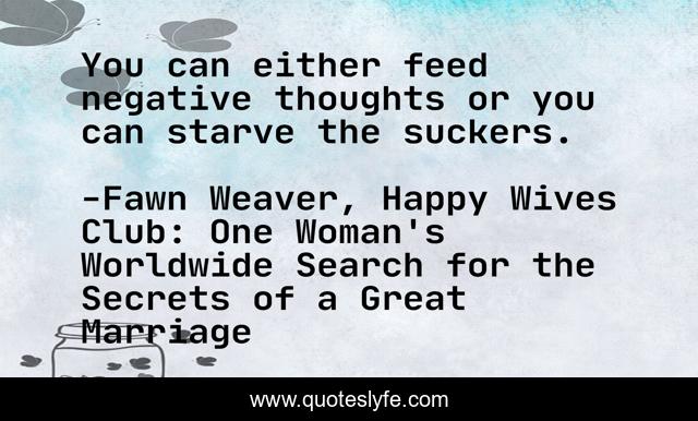 This page presents the quote "You can either feed negative thoughts or you can starve the suckers.". Author of this quote is Fawn Weaver, Happy Wives Club: One Woman's Worldwide Search for the Secrets of a Great Marriage. This quote is about marriage, negativity, positive-thinking,.