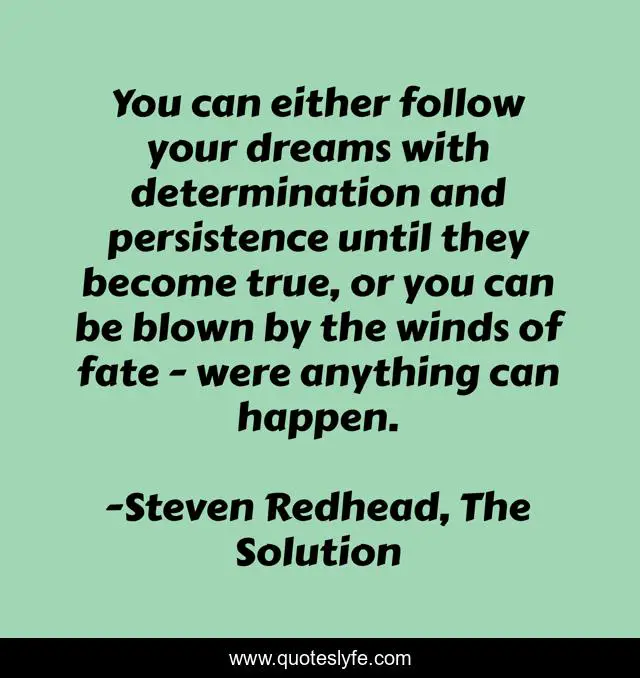 This page presents the quote "You can either follow your dreams with determination and persistence until they become true, or you can be blown by the winds of fate - were anything can happen.". Author of this quote is Steven Redhead, The Solution. This quote is about determination, happen, true, dreams, persistence,.
