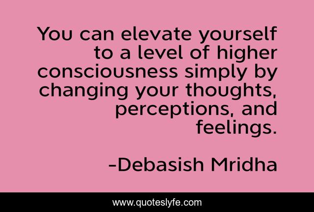 This page presents the quote "You can elevate yourself to a level of higher consciousness simply by changing your thoughts, perceptions, and feelings.". Author of this quote is Debasish Mridha. This quote is about perceptions, consciousness, changing-your-thoughts, philosophy, debasish-mridha, quotes, inspirational, enthusiasm, debasish-mridha-m-d,.
