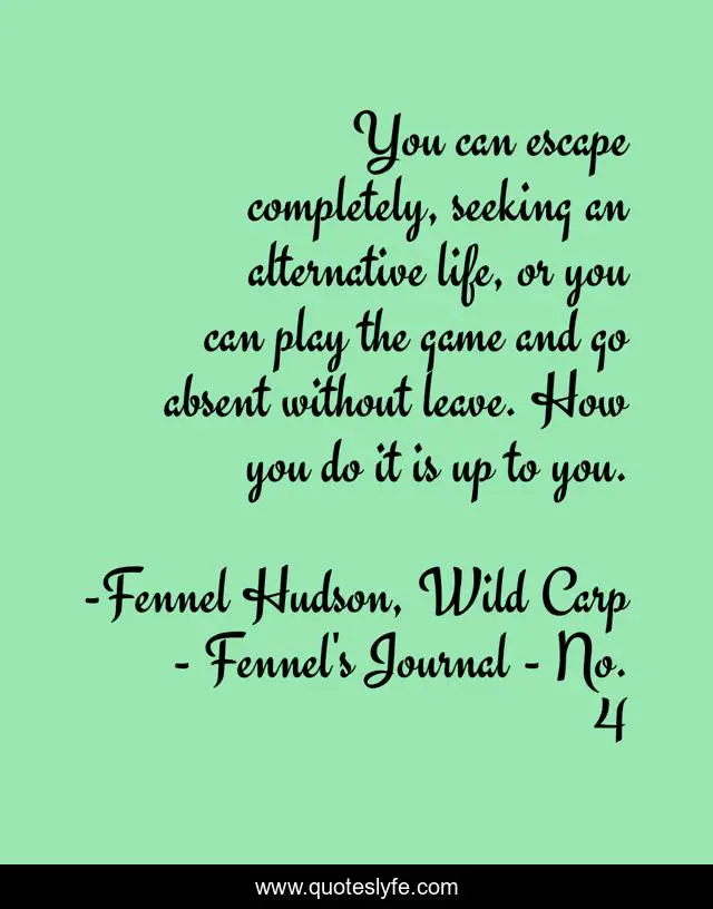 This page presents the quote "You can escape completely, seeking an alternative life, or you can play the game and go absent without leave. How you do it is up to you.". Author of this quote is Fennel Hudson, Wild Carp - Fennel's Journal - No. 4. This quote is about work-life-balance, stress, self-belief, life-purpose, adventure, reason-for-living,.