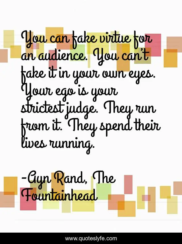 This page presents the quote "You can fake virtue for an audience. You can’t fake it in your own eyes. Your ego is your strictest judge. They run from it. They spend their lives running.". Author of this quote is Ayn Rand, The Fountainhead. This quote is about the-fountainhead, gail-wynand, virtue,.