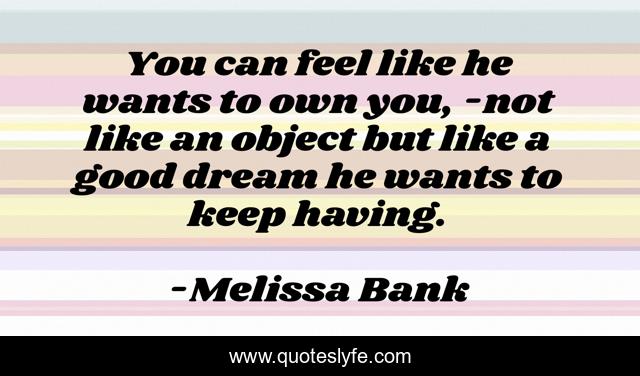 This page presents the quote "You can feel like he wants to own you, -not like an object but like a good dream he wants to keep having.". Author of this quote is Melissa Bank. This quote is about love, relationship, affection,.