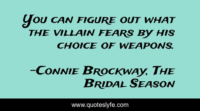 This page presents the quote "You can figure out what the villain fears by his choice of weapons.". Author of this quote is Connie Brockway, The Bridal Season. This quote is about weapons, advice, fear, villain,.