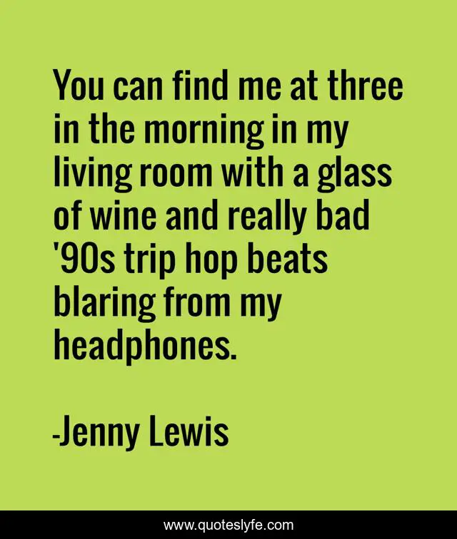 This page presents the quote "You can find me at three in the morning in my living room with a glass of wine and really bad '90s trip hop beats blaring from my headphones.". Author of this quote is Jenny Lewis. This quote is about me, glass, wine,.