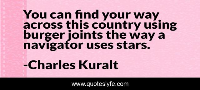 This page presents the quote "You can find your way across this country using burger joints the way a navigator uses stars.". Author of this quote is Charles Kuralt. This quote is about humor, food, travel, dining, stars, navigation,.