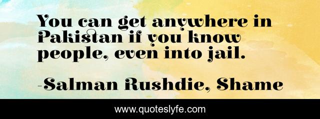 This page presents the quote "You can get anywhere in Pakistan if you know people, even into jail.". Author of this quote is Salman Rushdie, Shame. This quote is about pakistan, humour,.