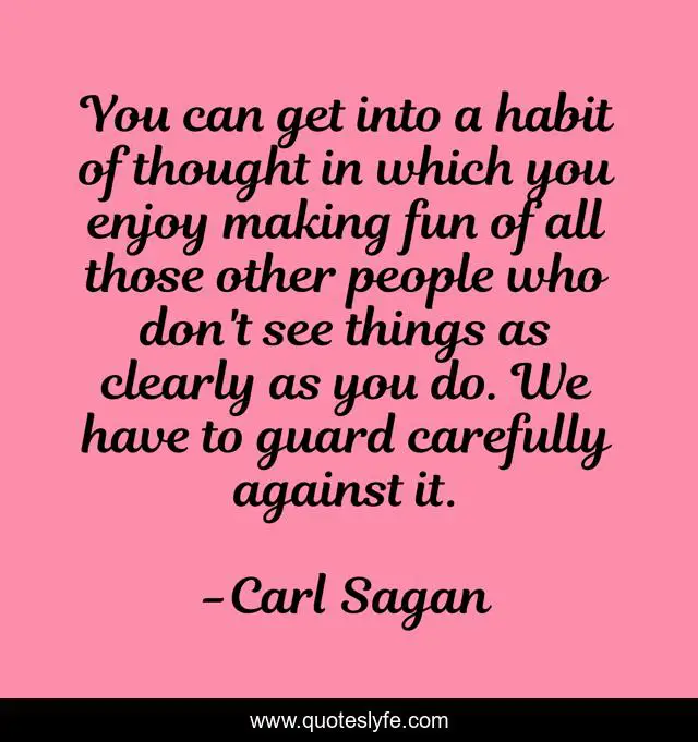 This page presents the quote "You can get into a habit of thought in which you enjoy making fun of all those other people who don't see things as clearly as you do. We have to guard carefully against it.". Author of this quote is Carl Sagan. This quote is about science, skepticism,.
