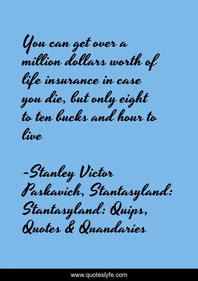 This page presents the quote "You can get over a million dollars worth of life insurance in case you die, but only eight to ten bucks and hour to live". Author of this quote is Stanley Victor Paskavich, Stantasyland: Stantasyland: Quips, Quotes & Quandaries. This quote is about money, minium-wage, cash, poverty, life-insurance, death-and-dying,.