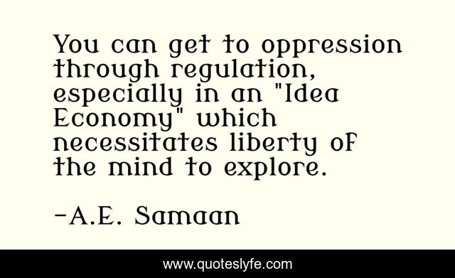 This page presents the quote "You can get to oppression through regulation, especially in an "Idea Economy" which necessitates liberty of the mind to explore.". Author of this quote is A.E. Samaan. This quote is about planned-economies, progressive-policy, idea-economy, technological-evolution, libertarianism, liberty, government-regulation, technological-progress, central-planners,.