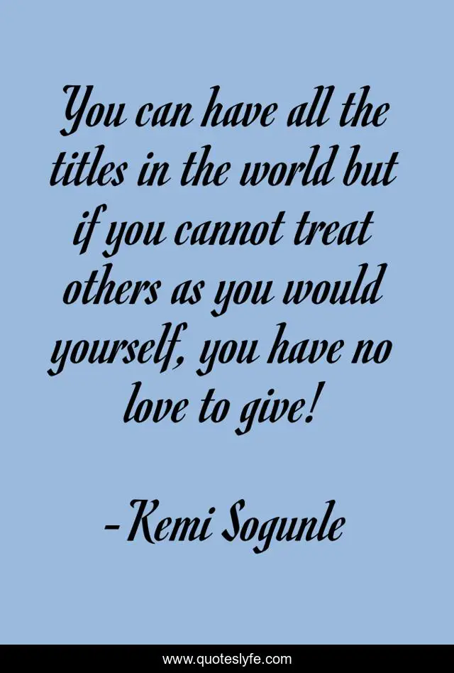 This page presents the quote "You can have all the titles in the world but if you cannot treat others as you would yourself, you have no love to give!". Author of this quote is Kemi Sogunle. This quote is about love, compassion, kindness-to-others, loving-others, loving-someone, kindness, affection,.