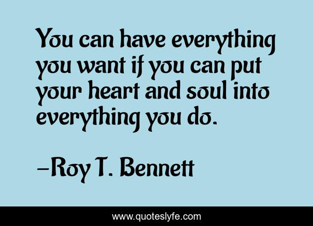 This page presents the quote "You can have everything you want if you can put your heart and soul into everything you do.". Author of this quote is Roy T. Bennett. This quote is about heart, inspiring, inspire, living, positive, energy, motivational, life, confidence,.