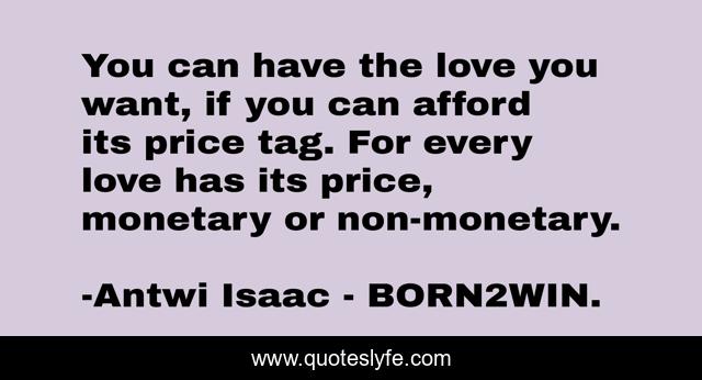 This page presents the quote "You can have the love you want, if you can afford its price tag. For every love has its price, monetary or non-monetary.". Author of this quote is Antwi Isaac - BORN2WIN.. This quote is about love, price, monetary, non-monetary, price-tag, affection,.