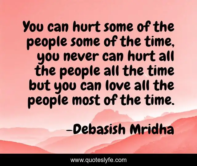 This page presents the quote "You can hurt some of the people some of the time, you never can hurt all the people all the time but you can love all the people most of the time.". Author of this quote is Debasish Mridha. This quote is about life, love, knowledge, inspirational, intelligence, philosophy, wisdom, quotes, affection,.
