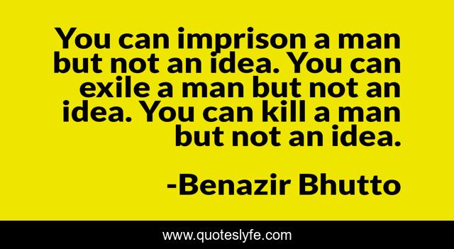 This page presents the quote "You can imprison a man but not an idea. You can exile a man but not an idea. You can kill a man but not an idea.". Author of this quote is Benazir Bhutto. .