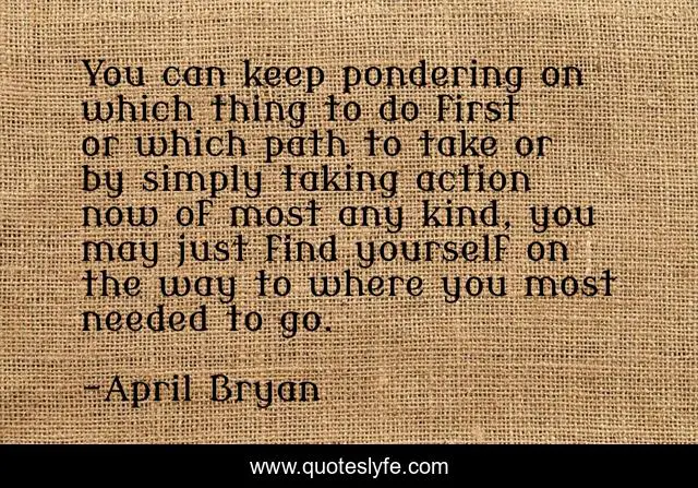 This page presents the quote "You can keep pondering on which thing to do first or which path to take or by simply taking action now of most any kind, you may just find yourself on the way to where you most needed to go.". Author of this quote is April Bryan. This quote is about confidence, dilemma, positive, motivational, choices, optimistic,.