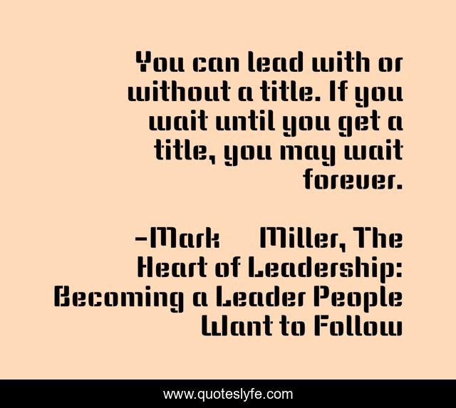 This page presents the quote "You can lead with or without a title. If you wait until you get a title, you may wait forever.". Author of this quote is Mark Miller, The Heart of Leadership: Becoming a Leader People Want to Follow. This quote is about leadership-and-management, leaders,.