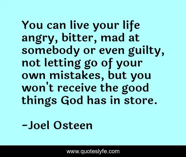 This page presents the quote "You can live your life angry, bitter, mad at somebody or even guilty, not letting go of your own mistakes, but you won't receive the good things God has in store.". Author of this quote is Joel Osteen. This quote is about god, life, mistakes,.