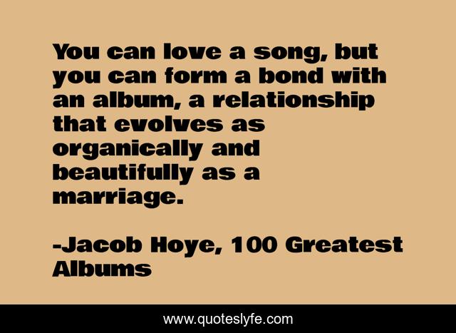 This page presents the quote "You can love a song, but you can form a bond with an album, a relationship that evolves as organically and beautifully as a marriage.". Author of this quote is Jacob Hoye, 100 Greatest Albums. .