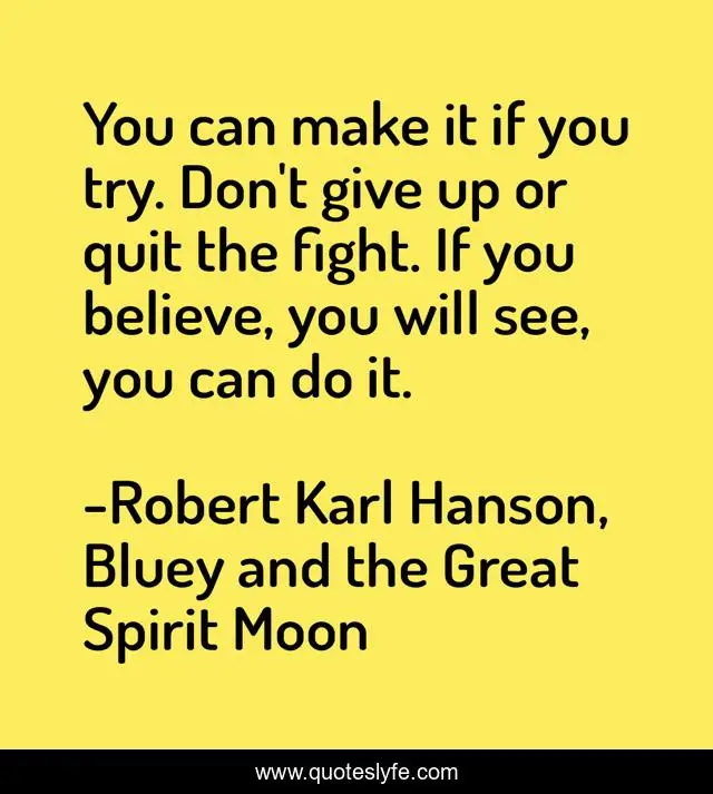 This page presents the quote "You can make it if you try. Don't give up or quit the fight. If you believe, you will see, you can do it.". Author of this quote is Robert Karl Hanson, Bluey and the Great Spirit Moon. This quote is about cute, sci-fi, kid-s-books, animation, adventure, children-s-book, cartoon,.