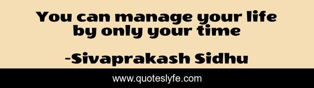 This page presents the quote "You can manage your life by only your time". Author of this quote is Sivaprakash Sidhu. This quote is about time-management, sivaprakash-sidhu, lessons-learned-in-life, sivaprakash, sivaprakash-gopal, time, life-and-living,.