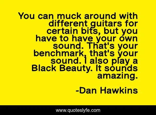 This page presents the quote "You can muck around with different guitars for certain bits, but you have to have your own sound. That's your benchmark, that's your sound. I also play a Black Beauty. It sounds amazing.". Author of this quote is Dan Hawkins. This quote is about play, black, beauty,.