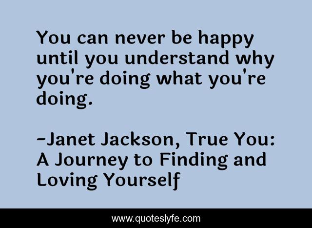 This page presents the quote "You can never be happy until you understand why you're doing what you're doing.". Author of this quote is Janet Jackson, True You: A Journey to Finding and Loving Yourself. This quote is about janet-jackson, true-you, happy,.