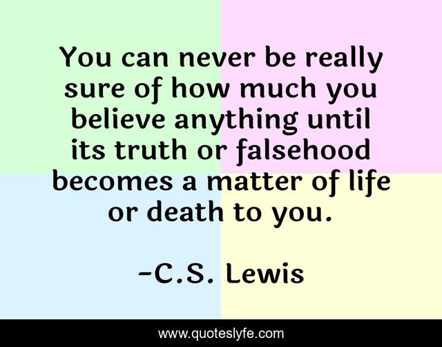 This page presents the quote "You can never be really sure of how much you believe anything until its truth or falsehood becomes a matter of life or death to you.". Author of this quote is C.S. Lewis. This quote is about beliefs, christianity,.