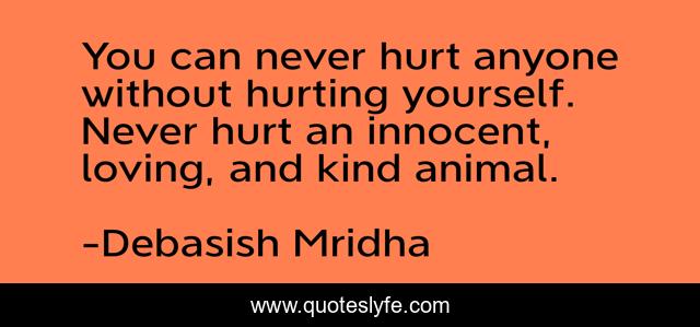 This page presents the quote "You can never hurt anyone without hurting yourself. Never hurt an innocent, loving, and kind animal.". Author of this quote is Debasish Mridha. This quote is about love, quotes, philosophy, debasish-mridha, life-wisdom, never-hurt-an-innocent-animal, inspirational, hurting-yourself, enthusiasm,.