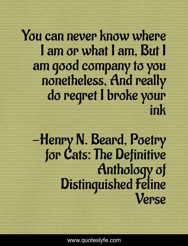 This page presents the quote "You can never know where I am or what I am, But I am good company to you nonetheless, And really do regret I broke your ink". Author of this quote is Henry N. Beard, Poetry for Cats: The Definitive Anthology of Distinguished Feline Verse. This quote is about humor, song-of-myself, cats, leaves-of-grass, walt-whitman,.