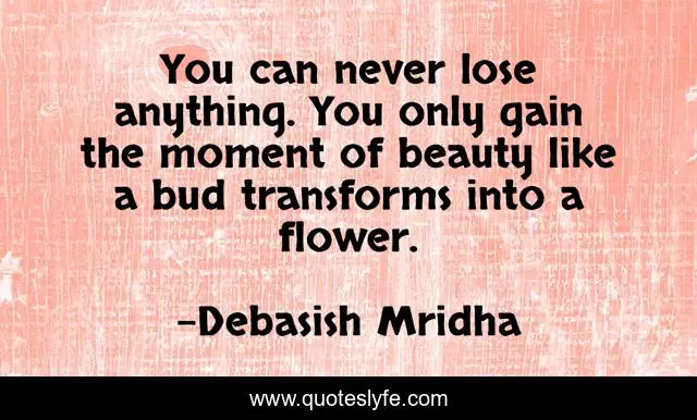 This page presents the quote "You can never lose anything. You only gain the moment of beauty like a bud transforms into a flower.". Author of this quote is Debasish Mridha. This quote is about philosophy, beauty, mridha, debasish, debasish-mridha, transform, you-can-never-lose-anything, inspirational, enthusiasm,.