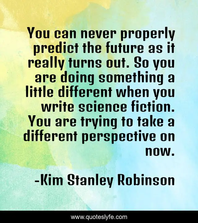 This page presents the quote "You can never properly predict the future as it really turns out. So you are doing something a little different when you write science fiction. You are trying to take a different perspective on now.". Author of this quote is Kim Stanley Robinson. This quote is about future, perspective,.