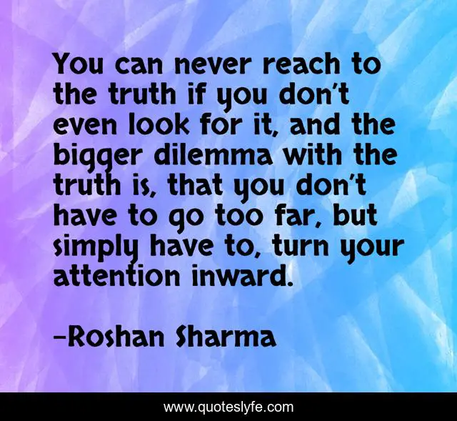 This page presents the quote "You can never reach to the truth if you don’t even look for it, and the bigger dilemma with the truth is, that you don’t have to go too far, but simply have to, turn your attention inward.". Author of this quote is Roshan Sharma. This quote is about beauty, god, insight, self-realization, bliss, grace,.