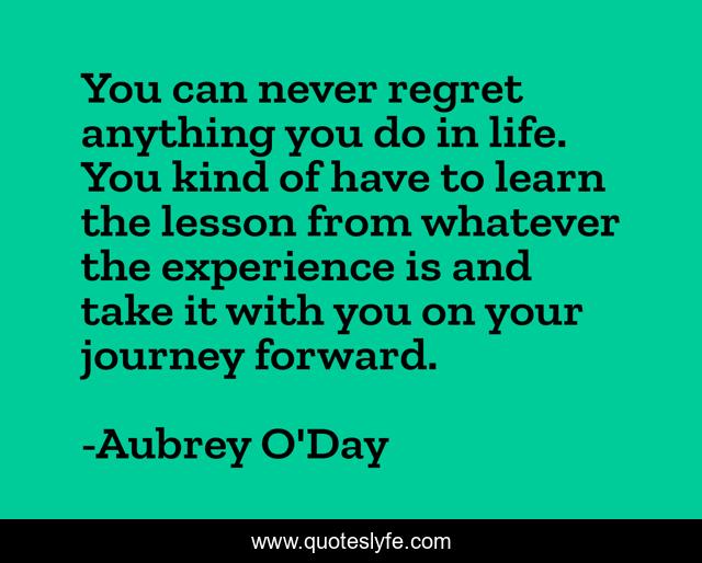 This page presents the quote "You can never regret anything you do in life. You kind of have to learn the lesson from whatever the experience is and take it with you on your journey forward.". Author of this quote is Aubrey O'Day. This quote is about life, journey, regret,.
