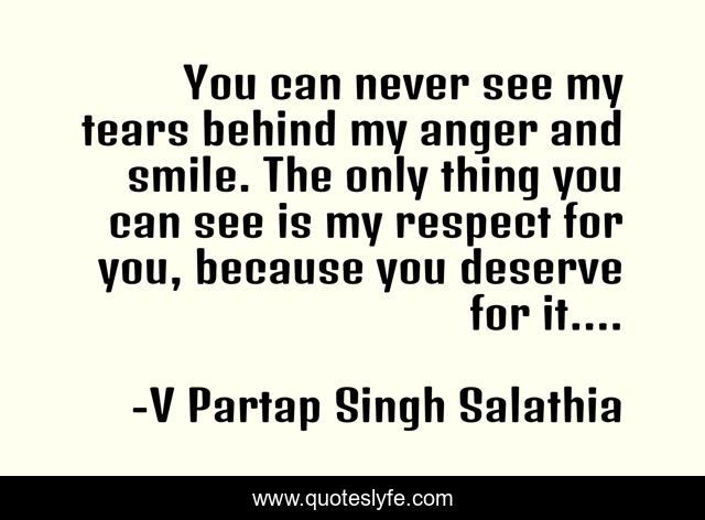 This page presents the quote "You can never see my tears behind my anger and smile. The only thing you can see is my respect for you, because you deserve for it....". Author of this quote is V Partap Singh Salathia. This quote is about emotional, tears, truth, respect,.