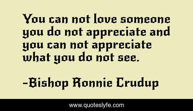 This page presents the quote "You can not love someone you do not appreciate and you can not appreciate what you do not see.". Author of this quote is Bishop Ronnie Crudup. This quote is about enthusiasm, gospel, inspirational, christianity,.