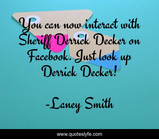 This page presents the quote "You can now interact with Sheriff Derrick Decker on Facebook. Just look up Derrick Decker!". Author of this quote is Laney Smith. This quote is about book-boyfriend, lock-creek, law-enforcement, officer-says-i-do, laney-smith, sheriff, deputy, law-of-attraction, policemen,.