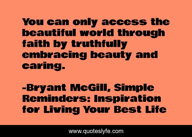 This page presents the quote "You can only access the beautiful world through faith by truthfully embracing beauty and caring.". Author of this quote is Bryant McGill, Simple Reminders: Inspiration for Living Your Best Life. This quote is about caring, faith, beauty, accessibility, embrace, truth,.