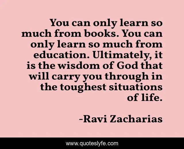 This page presents the quote "You can only learn so much from books. You can only learn so much from education. Ultimately, it is the wisdom of God that will carry you through in the toughest situations of life.". Author of this quote is Ravi Zacharias. This quote is about life, education, wisdom,.