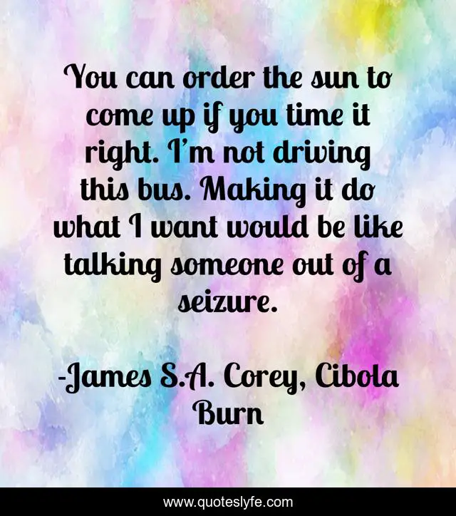 This page presents the quote "You can order the sun to come up if you time it right. I’m not driving this bus. Making it do what I want would be like talking someone out of a seizure.". Author of this quote is James S.A. Corey, Cibola Burn. This quote is about seizures, bus, orders, sun,.