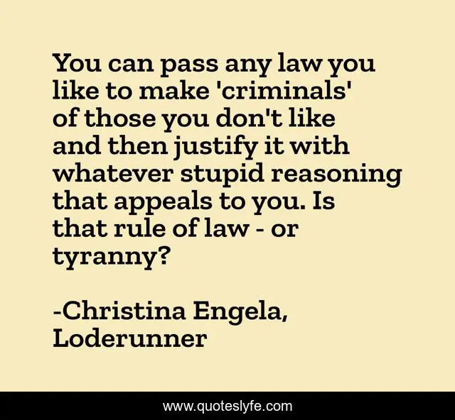 This page presents the quote "You can pass any law you like to make 'criminals' of those you don't like and then justify it with whatever stupid reasoning that appeals to you. Is that rule of law - or tyranny?". Author of this quote is Christina Engela, Loderunner. This quote is about tyranny, appeals, stupid-reasoning, rule, criminals, pass, law, justify,.