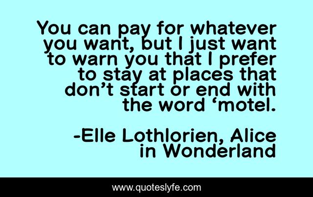 This page presents the quote "You can pay for whatever you want, but I just want to warn you that I prefer to stay at places that don’t start or end with the word ‘motel.". Author of this quote is Elle Lothlorien, Alice in Wonderland. .